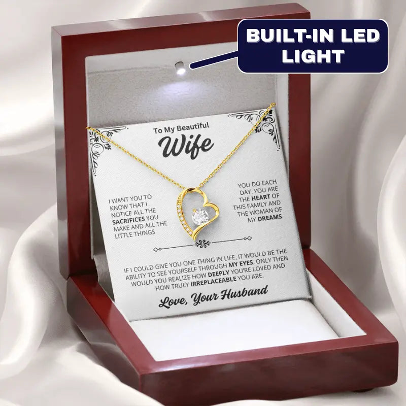 To my beautiful wife, I want you to know that I notice all the sacrifices you make and all the little things you do each day. You are the heart of this family and the woman of my dreams. If I could give you one thing in life, it would be the ability to see yourself through my eyes. Only then would you realize how deeply you’re loved and how truly irreplaceable you are. Love, your husband.